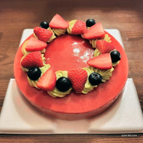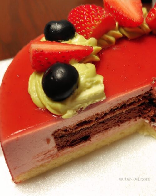 苺とラズベリーのムースでチョコムースを包んだ、直径15㎝の小ぶりなケーキです。