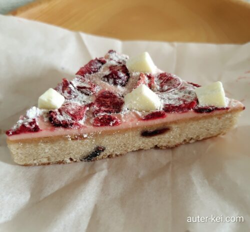 ストロベリーとクランベリー、ホワイトチョコレートチャンク、ストロベリークリームチーズフィリングを重ねた贅沢なベイクドスイーツ。