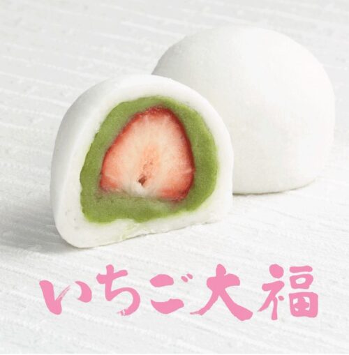 もちもちのおもちの中には、みずみずしくてジューシーないちごと抹茶あんの組み合わせ。